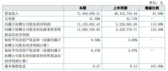 報(bào)告期內(nèi),公司實(shí)現(xiàn)營(yíng)業(yè)收入71,404,949.31元,較上年同期營(yíng)業(yè)收入48,415,754.44元,同比增長(zhǎng)47.48%,主要原因是公司所處行業(yè)顯著復(fù)蘇,工程機(jī)械行業(yè)更新?lián)Q代和新增需求,“一帶一路”基建需求刺激,以及國(guó)內(nèi)基礎(chǔ)設(shè)施投資建設(shè)剛需所致;報(bào)告期內(nèi)實(shí)現(xiàn)利潤(rùn)總額13,095,099.29元,實(shí)現(xiàn)凈利潤(rùn)11,012,334.84元,產(chǎn)品銷售毛利率為41.58%,較上年同期毛利率42.71%,降低1.13%,毛利下降的原因主要是因?yàn)椴牧铣杀驹黾印?