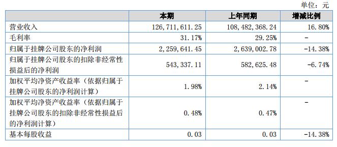 公司在報告期內(nèi)的主營業(yè)務(wù)收入為12,671.16萬元,比上年同期增長16.80%;營業(yè)成本為8,721.72萬元,比上年同期增長13.63%;2018年上半年毛利率31.17%,較去年同期上升1.92%;歸屬于母公司的凈利潤為225.96萬元,比上年同期下降14.38%。?