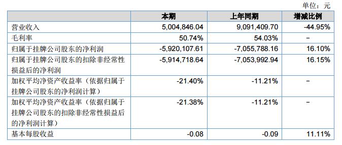 報(bào)告期內(nèi),公司實(shí)現(xiàn)營(yíng)業(yè)收入約為500.48萬元,較上年同期減少408.66萬元,同比降低44.95%,歸屬于公司股東的凈利潤(rùn)約為-592.01萬元,較上年同期少虧損113.57萬元,同比增長(zhǎng)16.10%。