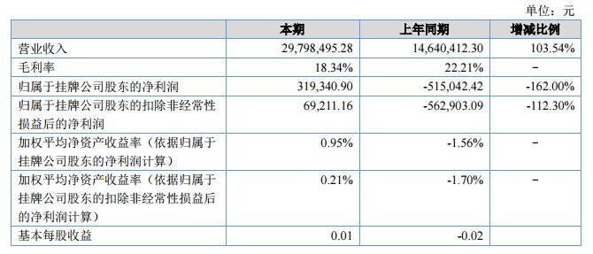 2018年上半年公司完成營業(yè)收入29,798,495.28元,比上年同期增長15,158,082.98元,增幅103.54%;凈利潤為319,340.90元,較上年同期期增加834,383.32元。?