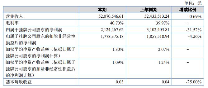 報告期內(nèi)公司實現(xiàn)營業(yè)收入52,070,546.61元,同比下降0.69%;實現(xiàn)凈利潤1,781,319.50元,同比下降26.45%。?