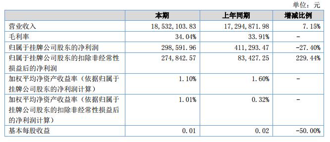 報告期內(nèi),公司實現(xiàn)營業(yè)收入18,532,103.83元,同比增長7.15%,扣非后凈利潤274,842.57元,同比增長229.44%%。營業(yè)收入較上年同期有小幅度增長,利潤剔除非經(jīng)常性損益的因素較上年增長幅度較大。?