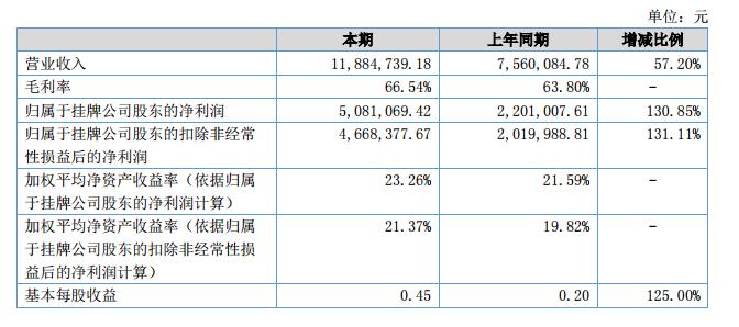 報(bào)告期內(nèi),公司實(shí)現(xiàn)營(yíng)業(yè)收入1,188.47萬(wàn)元,較去年同期增加了432.47萬(wàn)元,同比增幅57.20%;報(bào)告期實(shí)現(xiàn)凈利潤(rùn)508.11萬(wàn)元,比上年同期增加了281.08萬(wàn)元,增幅124%.