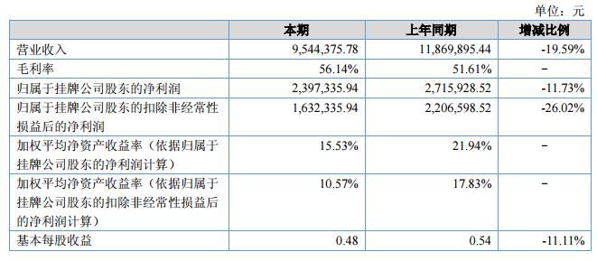 報告期內(nèi),營業(yè)收入9,544,375.78元,較上年同期的11,869,895.44元下降了19.59%,主要是客戶項目延期,本期銷售合同供貨期較長造成收入確認(rèn)延遲所致;營業(yè)成本4,186,129.20元,較上年同期的5,743,947.94元下降了27.12%,主要是隨著營業(yè)收入波動而相應(yīng)變化;歸屬于掛牌公司股東的凈利潤為2,397,335.94元,較上年同期的2,715,928.52元下降了11.73%。?
