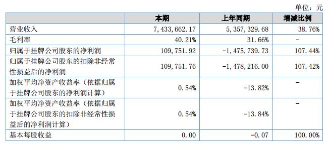 報(bào)告期內(nèi)公司實(shí)現(xiàn)營業(yè)收入7,433,662.17元,較上年同期上升了2,076,332.49元,上升比例為38.76%;報(bào)告期實(shí)現(xiàn)凈利潤109,751.92元,較上年同期上升了107.44%。