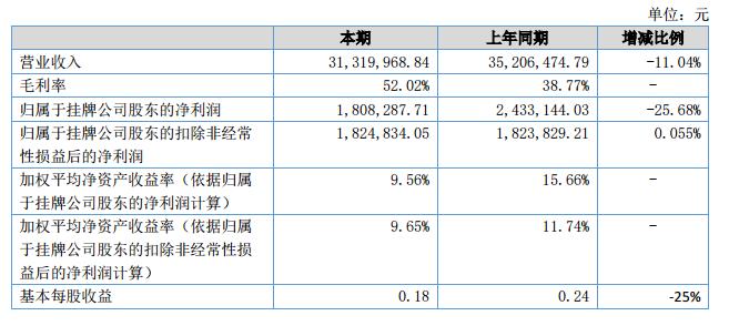 2018年上半年公司實(shí)現(xiàn)營(yíng)業(yè)收入3132萬(wàn)元,同比減少11%;凈利潤(rùn)為172萬(wàn)元,同比減少27.56%。2018年上半年公司的總資產(chǎn)為8264.97萬(wàn)元,增長(zhǎng)了9.08%。凈資產(chǎn)為1981.05萬(wàn)元,增長(zhǎng)了10%左右。?