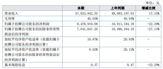 報(bào)告期內(nèi),公司實(shí)現(xiàn)營業(yè)收入5,703.39萬元,較上年同期增長17.15%;本期凈利潤823.88萬元,較上年同期下降22.82%。?