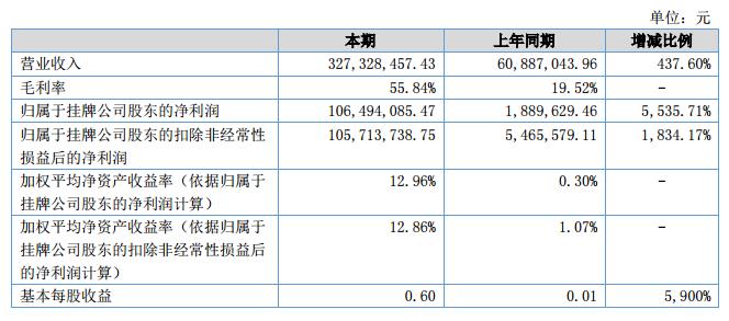 報告期內(nèi),公司實現(xiàn)營業(yè)收入327,328,457.43元,同比增加437.60%;營業(yè)成本為144,539,431.64元,較去年同期增加194.96%,毛利率為55.84%,較去年同期上升36.32%;凈利潤為106,494,085.47元,較去年同期增加5,535.71%。