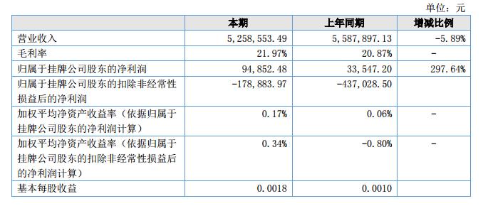 報告期內(nèi),公司實現(xiàn)營業(yè)收入525.86萬元,同比下降5.89%;營業(yè)成本410.30萬元,同比下降7.2%;毛利率21.97%,同比上升1.10%;凈利潤13.34萬元,同比上升297.64%。?