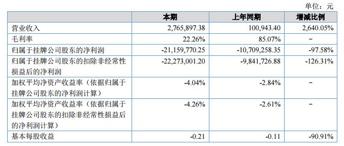 報(bào)告期內(nèi)公司實(shí)現(xiàn)主營(yíng)業(yè)務(wù)收入276.59萬元,比上年同期增加266.50萬元,增幅2,640.05%;公司主營(yíng)業(yè)務(wù)成本215.01萬元,同比增加213.50萬元,增幅14,139.07%;公司實(shí)現(xiàn)凈利潤(rùn)-2,115.98萬元,比去年同期-1,070.93萬元相比減少了1,045.05萬元,降幅為97.58%。