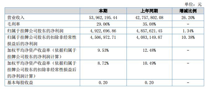 報(bào)告期內(nèi)公司實(shí)現(xiàn)營(yíng)業(yè)收入53,962,195.44元,較上年同期增長(zhǎng)了26.20%,實(shí)現(xiàn)凈利潤(rùn)4,922,696.86元,較上年同期增長(zhǎng)了1.34%。截止2018年06月30日,公司總資產(chǎn)為70,575,767.76元,較期初增長(zhǎng)了5.79%,凈資產(chǎn)為54,139,141.00元,比期初增長(zhǎng)10.00%。2018年上半年經(jīng)營(yíng)活動(dòng)產(chǎn)生現(xiàn)金流量?jī)纛~是2,593,461.17元,較上年同期減少77.17%,主要是由于今年上半年購(gòu)買(mǎi)材料支付的現(xiàn)金比上年同期增長(zhǎng)1000多萬(wàn)元所致。?