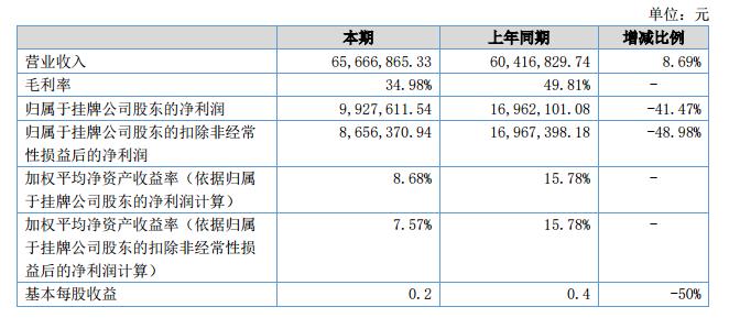 公司在報(bào)告期內(nèi)的主營(yíng)業(yè)務(wù)收入為65,666,865.33元比上期增長(zhǎng)8.67%;營(yíng)業(yè)成本為42,696,877.14元,比上期增長(zhǎng)40.82%;歸屬于母公司的凈利潤(rùn)為9,927,611.54元,比上期減少41.47%。?