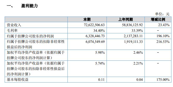 挖貝網(wǎng)訊 9月16日消息,華夏飛機(jī)(證券代碼:834310)近日公布的2018年半年報(bào)顯示,截至2018年6月30日,企業(yè)實(shí)現(xiàn)營(yíng)收7262.25萬(wàn)元;歸屬于掛牌公司股東的凈利潤(rùn)為6,328,446元。