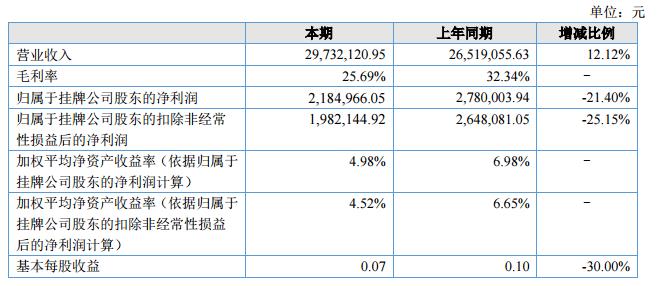 報告期內(nèi),公司實現(xiàn)營業(yè)收入29,732,120.95元,比去年同期增加3,213,065.32元,同比增長12.12%,歸屬于掛牌公司股東的凈利潤2,184,966.05元,比去年同期減少595,037.89元,同比減少21.40%。公司報告期末總資產(chǎn)75,652,408.61元,比年初下降3.73%;凈資產(chǎn)43,292,856.29元,比年初下降1.74%;負(fù)債總額32,359,552.32元,同比下降6.27%。公司經(jīng)營活動現(xiàn)金凈流量4,350,443.69元,上年同期為-3,134,572.73元,比同期增加7,485,016.42元,公司正常的經(jīng)營活動產(chǎn)生現(xiàn)金凈流量有了較大的改善。?