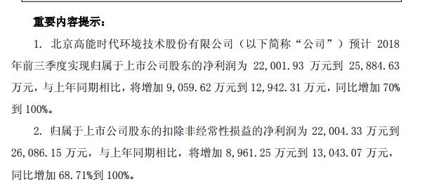 高能環(huán)境稱,經(jīng)公司財務部門初步測算,預計 2018 年前三季度利潤在2.2億元-2.59億元之間,與上年同期相比,將增加 9,059.62 萬元到1.29億元,同比增加 70%到 100%。