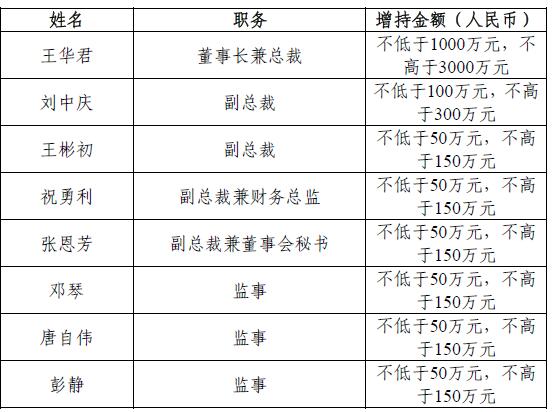 公告稱,董事長兼總裁王華君、副總裁劉中慶、副總裁王彬初、副總裁兼財務(wù)總監(jiān)祝勇利、副總裁兼董事會秘書張恩芳、監(jiān)事鄧琴、監(jiān)事唐自偉、監(jiān)事彭靜將增持,其中王華君增持金額不低于1000萬不高于3000萬,其他高管增持金額都不低于50萬。