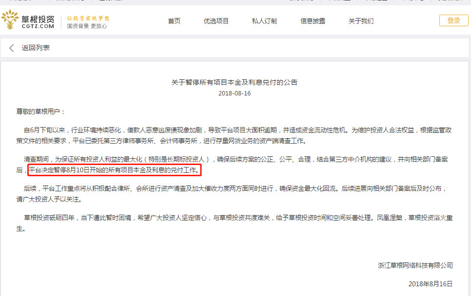 8月16日,草根投資發(fā)布關(guān)于平臺實施 “涅槃計劃”及近期工作的匯報,與此同一天,草根投資決定暫停8月10日開始的所有項目本金及兌付工作。