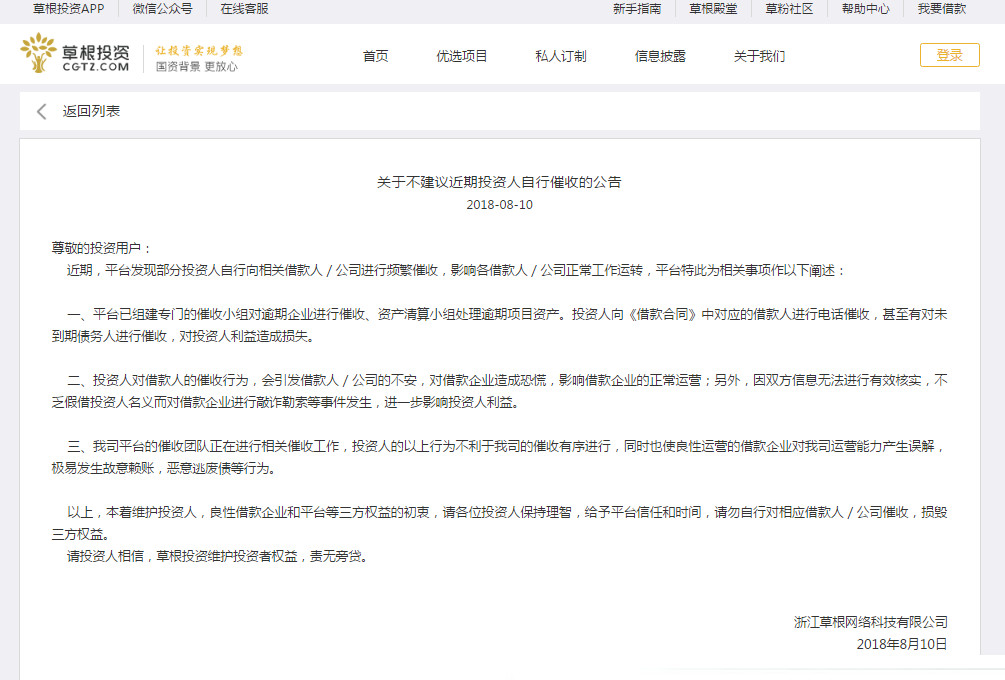 盡管如此,還是有不少投資人不買賬,隨即,草根投資在8月10日發(fā)布《關(guān)于不建議近期投資人自行催收的公告》。