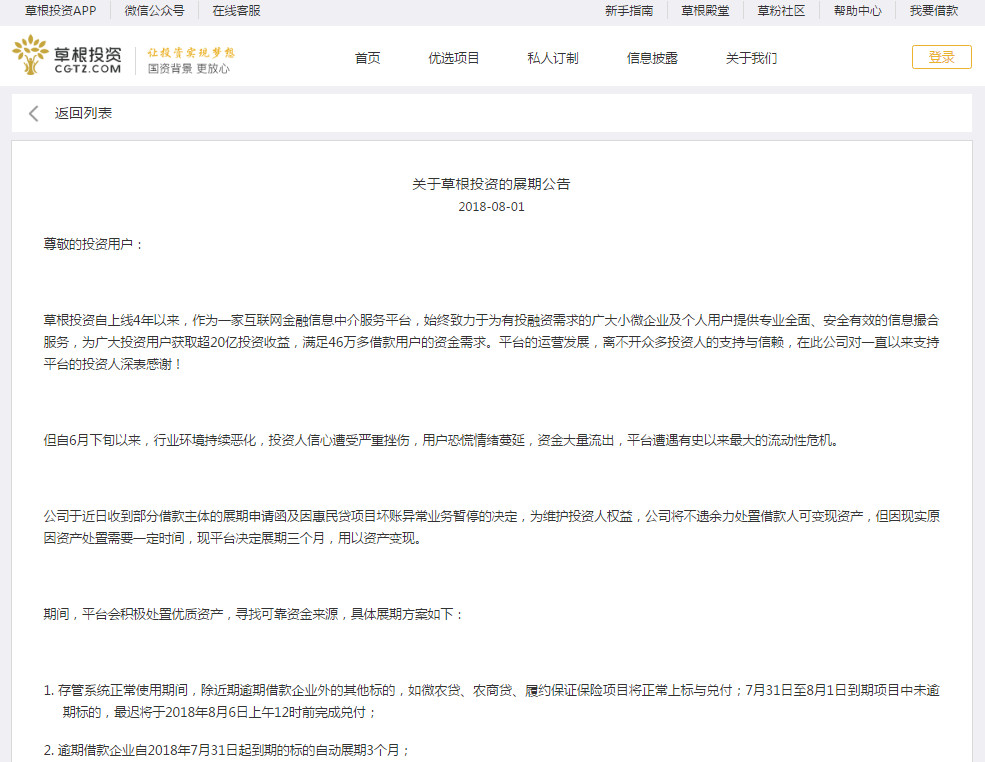 事實上,到了7月31日,草根投資資金出現(xiàn)問題,投資者紛紛討要說法,草根投資再也偽裝不下去了,在有關(guān)部門的主持下,草根投資在8月1日上午召開了投資者見面會,下午發(fā)布了展期公告。