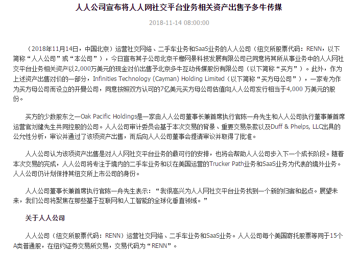 11月14日早上8點(diǎn),運(yùn)營社交網(wǎng)絡(luò)、二手車業(yè)務(wù)和SaaS業(yè)務(wù)的人人公司,通過人人網(wǎng)公布了一則消息。